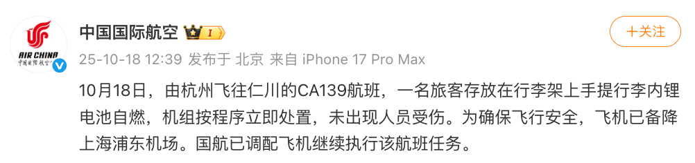 10月18日,CA139航班一名旅客手提行李内锂电池自燃,机组按程序处置,未有人员受伤,飞机备降上海浦东机场,国航调配飞机继续执行任务。