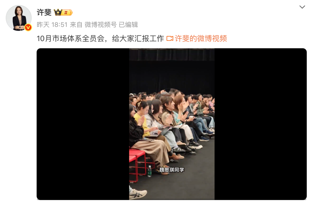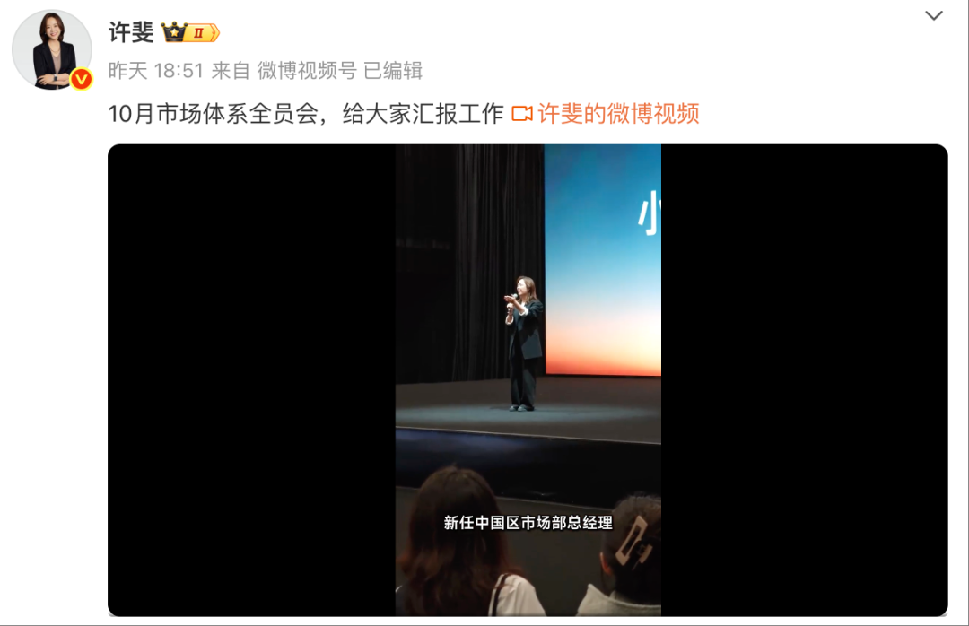 10月17日晚,小米集团副总裁、CMO许斐在社交媒体平台公布小米10月市场体系全员会的现场视频。在本次大会中,许斐称魏思琪为“新任中国区市场部总经理”。视频中,许斐表示,“我们这一年,变化非常非常的大,就是我们业务在不断的进步,需要我们的组织有相应的变化来适配它,大家觉得最欣喜的,新任中国区市场部总经理魏思琪同学,也是带领整个团队,打了一场战,打得非常漂亮。”