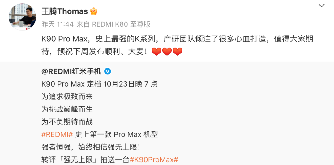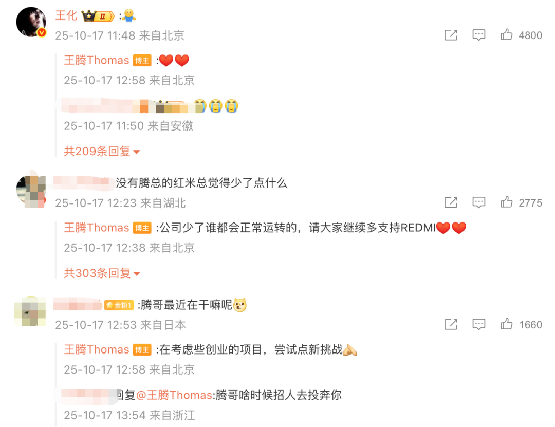 9月9日,王腾发布微博称:“关于我的离职网上看到很多谣言,都是假消息,简直离谱。说明一下,没有窃取公司机密出售,没有收人钱财。有失职行为,在深刻反省中,但没有做违法行为!谣言止于智者,还是请大家多关心未来要上市的新品吧。”10月17日,王腾在微博平台转发红米手机官方推文并表示:“K90 Pro Max,史上最强的K系列,产研团队倾注了很多心血打造,值得大家期待,预祝下周发布顺利、大麦!”在该条微博评论区,小米集团公关部总经理王化评论区回复“拥抱”表情,王腾也回复比心表情。此外,还有网友称“没有腾总的红米总觉得少了点什么”,王腾回应称“公司少了谁都会正常运转的,请大家继续多支持REDMI”;同时,王腾还表示最近“在考虑些创业的项目,尝试点新挑战”(关键词4:王腾创业)。