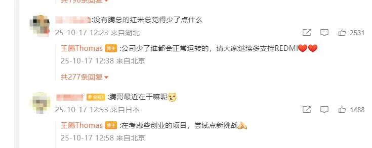 在评论区,有网友称“没有腾总的红米总觉得少了点什么”,王腾回应称“公司少了谁都会正常运转的,请大家继续多支持REDMI”;此外,王腾称最近“在考虑些创业的项目,尝试点新挑战”,展现了其积极进取的态度。