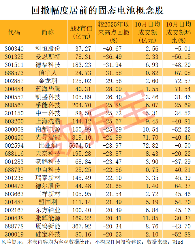 不过,市场总是充满变数。据数据宝统计,10月17日收盘价与年内高点相比,24只固态电池概念股回撤幅度超20%,德福科技、中一科技、上海洗霸、先导智能等年内翻倍牛股名列其中,投资者需谨慎对待市场波动。