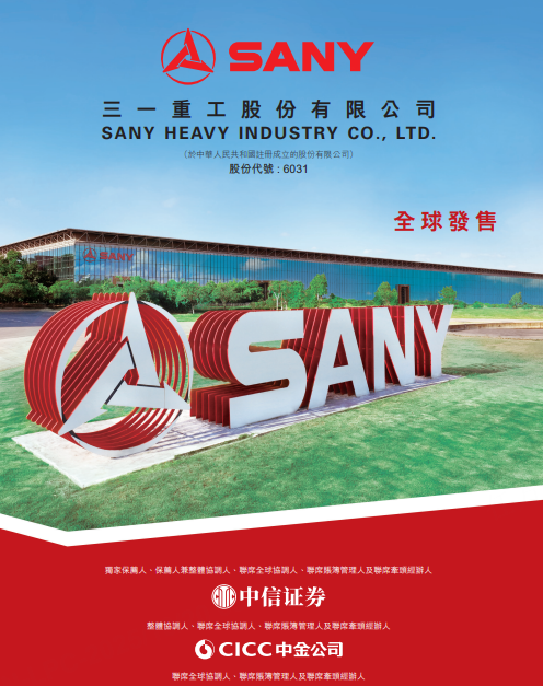 中国工程机械企业三一重工今日起至周四招股,发售5.8亿股H股,每股招股价20.3-21.3港元,集资最多123.63亿港元,预期10月28日挂牌,中信证券为保荐人。