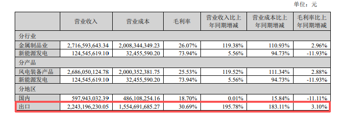 这源于公司海外业务的爆发。2025年上半年,大金重工出口收入22.4亿元,同比大涨195.78%;国内收入约6亿元,基本持平。而且出口业务的毛利率30.7%,远高于国内18.7%的毛利率。