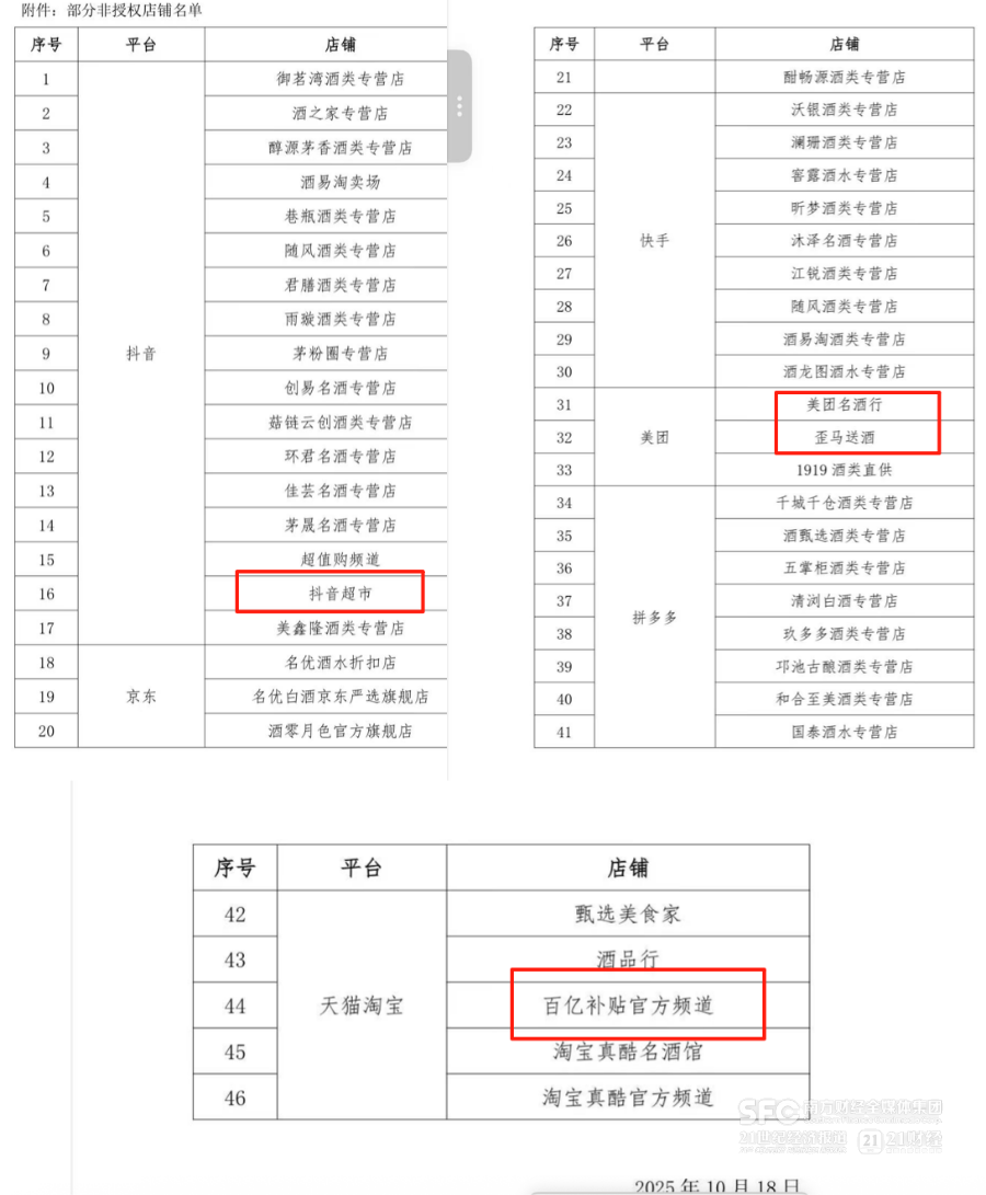 21世纪经济报道记者注意到,五粮液此次首次披露了46家非授权店铺名单,各大电商的第三方店铺均有上榜,此外还首次点名了多家电商的官方店铺或官方频道,包括抖音的抖音超市、美团的美团名酒行和歪马送酒、天猫淘宝的百亿补贴频道。