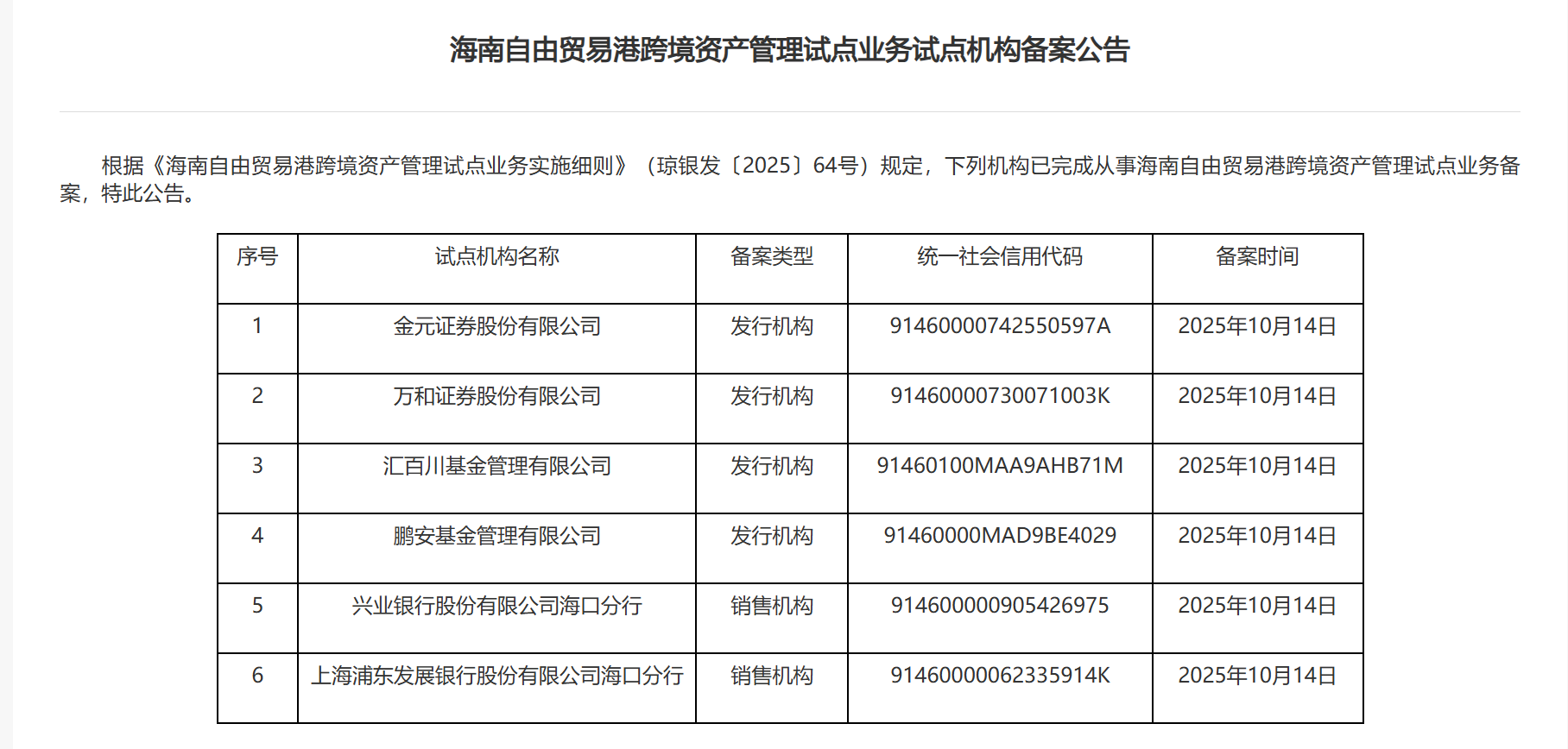 近日,中国证监会海南监管局消息,金元证券、万和证券、汇百川基金、鹏安基金、兴业银行海口分行和浦发银行海口分行共计6家机构已完成从事海南自由贸易港跨境资产管理试点业务备案,备案时间均为2025年10月14日,标志着海南自贸港金融开放迈出重要一步。