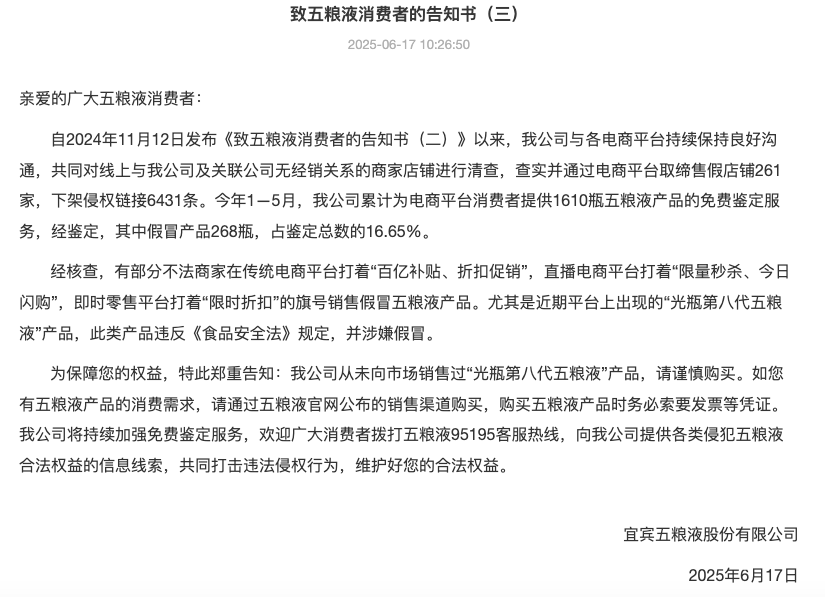 今年6.18前夕,即6月17日,五粮液在官网发布《致消费者的告知书(三)》称:今年1—5月,公司累计为电商平台消费者提供1610瓶五粮液产品的免费鉴定服务,经鉴定,其中假冒产品268瓶,占鉴定总数的16.65%,凸显电商售假问题。