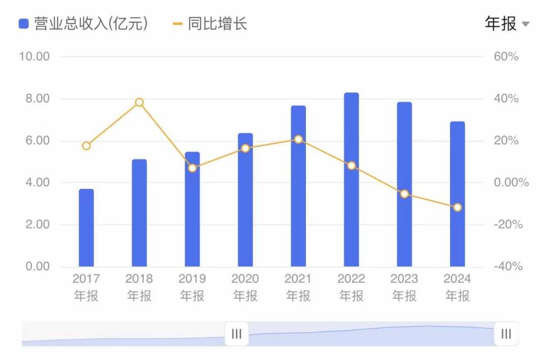 寿仙谷自2017年5月登陆上交所以来,营收曾保持连续六年正增长,从上市初期的3.7亿元攀升至2022年的历史峰值8.29亿元,累计增幅达124%。然而,这一增长趋势在2023年首次中断,全年营收同比下降5.39%至7.84亿元。2024年业绩进一步恶化,营收同比降幅扩大至11.81%,市场环境变化对公司影响显著。