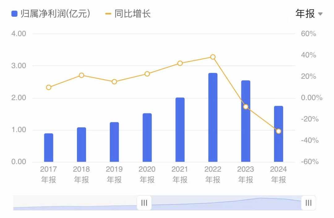 寿仙谷的归母净利润走势与营收高度同步,但盈利能力近期恶化则更为显著。2023年,公司归母净利润首次出现8.39%的负增长,2024年降幅呈断崖式扩大至31.34%,公司面临较大盈利挑战。