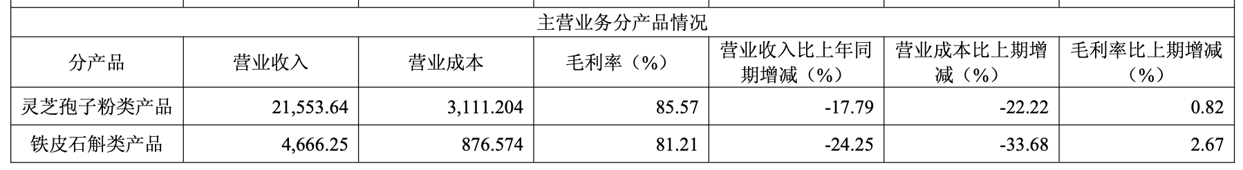 铁皮石斛类产品营收为4666.25万元,占比为15.83%,同比下滑24.25%,产品营收下滑明显。