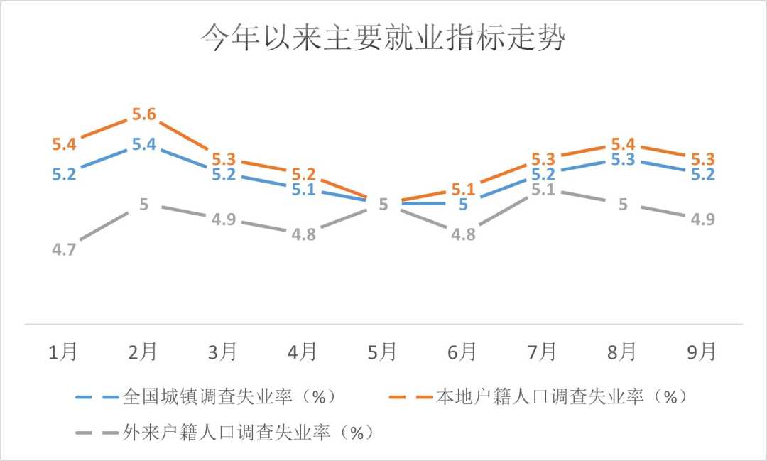 我国就业形势总体稳定,9月份,全国城镇调查失业率为5.2%,本地户籍劳动力调查失业率为5.3%,外来户籍劳动力调查失业率为4.9%,31个大城市城镇调查失业率为5.2%,均比上月下降0.1个百分点。但上述指标均比去年同期提高0.1个百分点,显示出就业形势仍然复杂严峻,就业市场动态值得深入剖析。