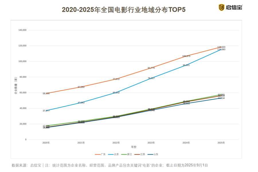 有趣的是,广东不仅是“最能花钱”的观影大省,也是影视业的创业热土。据启信宝统计,截至2025年9月,全国1.91万家影院相关企业中,有17%“落户”广东,总量达3233家。在全国电影相关企业数量分布中,广东更是以11.8万家高居榜首,与拥有11.5万家企业、位列第二的北京共同占据全国近四分之一的市场份额。浙江、江苏和山东则分别以5.7万、5.6万和5.3万家的规模排在第三至第五位。这一格局连续六年保持稳定,显示出人才资本的聚集与高密度的消费市场,正成为电影行业区域竞争难以改变的核心,电影产业区域竞争格局稳固。