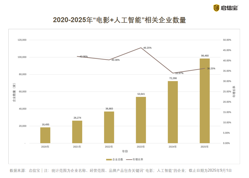 为应对市场变化,降本增效和创造新体验正在成为行业刚需,AI技术由此加速渗透。启信宝数据显示,截至2025年9月,我国经营范围包含“电影、人工智能”的企业总数已超过9.8万家,相比于2020年的1.8万家,6年内增长432.36%,增速高于行业整体水平,AI技术加速电影行业变革。