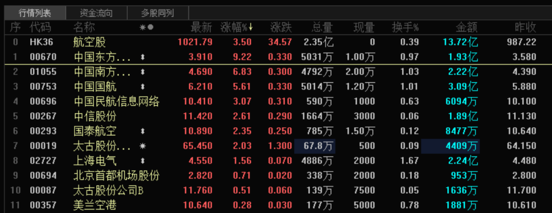 航空股悄然大涨。今日午后,港股市场航空股板块大涨达3.5%,板块个股亦是全线上扬。截至A股收盘,中国东航、南方航空、华夏航空、海航控股、中国国航等亦涨幅显著。