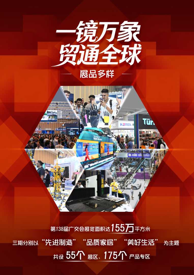 第138届广交会10月15日至11月4日在广州分三期举办,展览面积155万平方米,展位7.46万个,参展企业超3.2万家,约3600家企业首次亮相,助力外贸高质量发展。