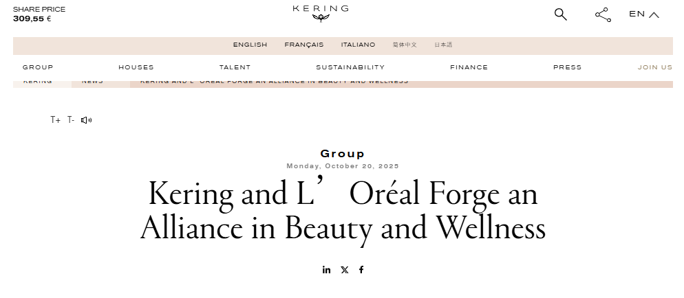 德梅奥表示:“此次战略联盟对开云而言是关键一步。与全球美妆领导者联手,能加速旗下主要品牌在香水和化妆品领域的发展,实现规模效应,释放长期潜力,就像伊夫圣罗兰美妆在欧莱雅管理下取得成功那样。”