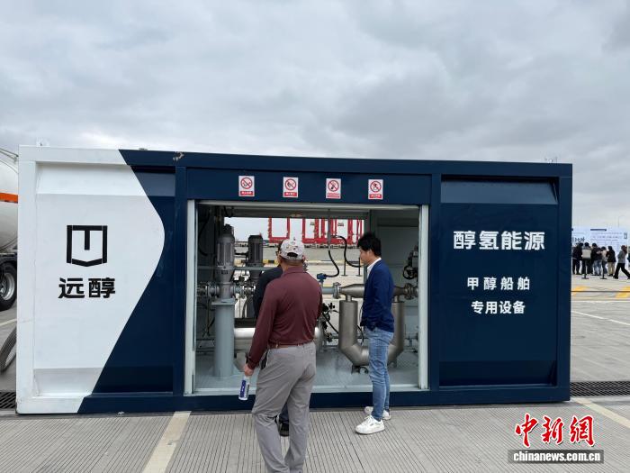20日,全球首艘甲醇电动集散两用船“远醇001”号首航仪式在上海港罗东集装箱码头举行。图为仪式现场展示的甲醇船舶专用设备。谢梦圆摄