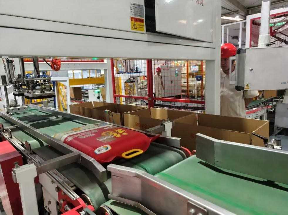 粮食生产线上,一袋袋大米被打包入箱。人民网记者李栋摄