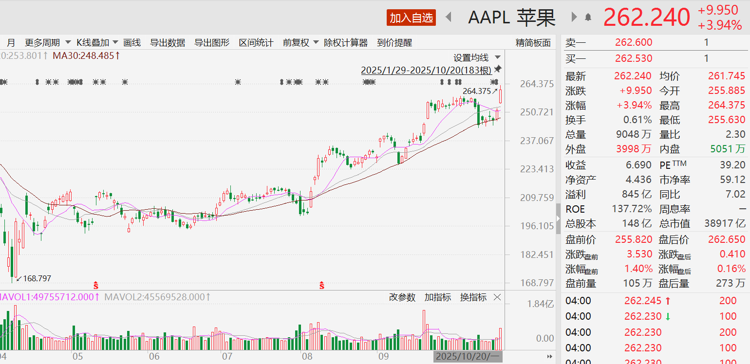 受上述消息影响,苹果美股当地时间涨约4%,创历史新高,总市值升至3.89万亿美元,超越微软成为美国第二大市值公司。Evercore ISI等机构看好 iPhone 需求引领苹果第四季度业绩增长,其表示:“iPhone需求数据表明其可能超过了iPhone的平均更新周期。”