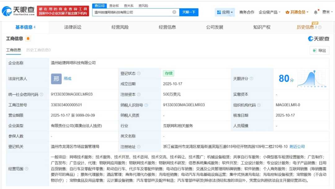 温州哈捷网络科技成立,哈啰出行全资持股共享新领域