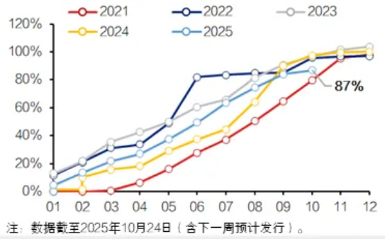 截至10月21日,今年新增专项债已发行3.73亿元,同比增长了约3%,但发行进度低于往年。年初两会确定的2025年新增地方政府专项债券限额为4.4万亿元,较2024年增加了5000亿。据此,今年新增专项债完成了发行工作的85%,而前两年同期的进度均已超过90%,凸显今年地方债发行节奏的特殊性。