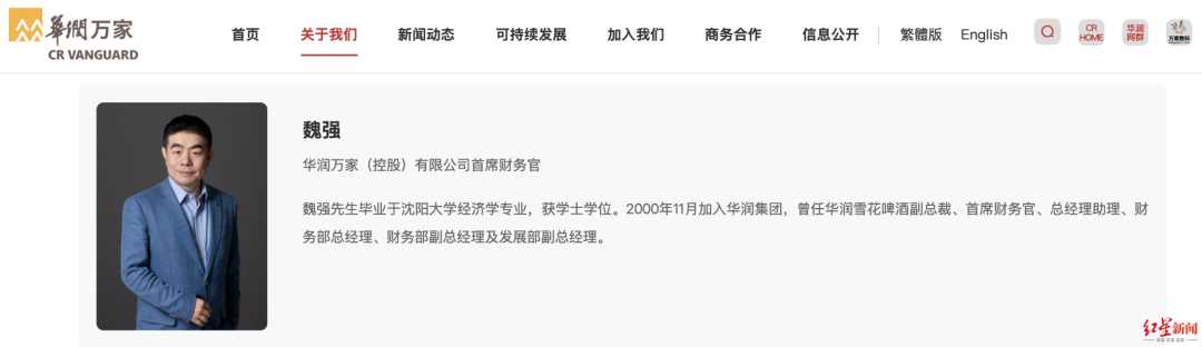 魏强已在华润万家任职CFO 图源:华润万家官网