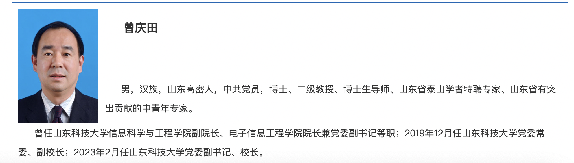 山东科技大学此前发布的简历显示,曾庆田为山东高密人,博士、二级教授、博士生导师、山东省泰山学者特聘专家、山东省有突出贡献的中青年专家。曾任山东科技大学信息科学与工程学院副院长、电子信息工程学院院长兼党委副书记等职;2019年12月任山东科技大学党委常委、副校长;2023年2月任山东科技大学党委副书记、校长。主要从事互联网信息服务、物联网应用软件、无线传感器网络、业务流程管理、应急信息管理等方面的研究工作。