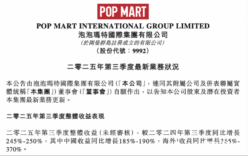 泡泡玛特2025年三季度业绩强势增长,整体收益同比增245%-250%,中国市场增185%-190%,海外增365%-370%。各渠道及海外区域均增长显著,摩根大通上调其评级与目标价。
