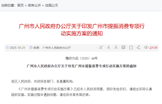 10月21日,广州市人民政府办公厅印发《广州市提振消费专项行动实施方案》(简称《方案》),《方案》从居民增收、服务消费、大宗消费、环境优化等方面提出多项具体任务,旨在全面提振消费,促进消费升级。