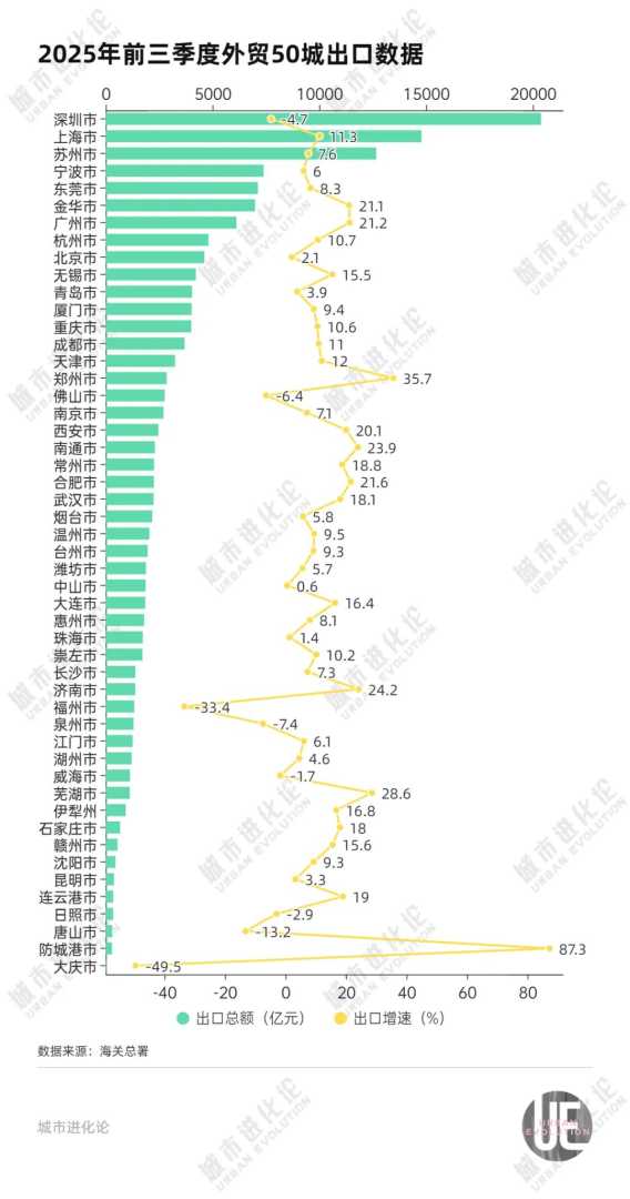 此外,金华、厦门和青岛也居外贸十强城市之列。相较于2024年末,金华一举反超后两座城市,实现排位“二级跳”。海关数据显示,前三季度,金华实现外贸进出口总值7906.6亿元,同比增长20.7%。其中,出口6993亿元,同比增长21.1%,“新三样”(电动汽车、锂电池、光伏产品)和劳密产品成为金华出口的重要增长动力。