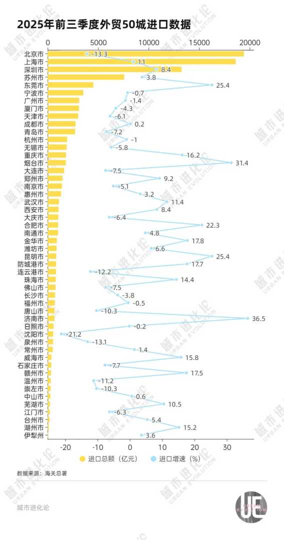 今年前三季度,我国货物贸易进出口33.61万亿元,同比增长4%。深圳、上海等外贸大市稳住阵脚,东莞反超宁波,金华实现排位“二级跳”。烟台、西安外贸规模提升,佛山、福州等传统外贸大市压力重重。全国城市外贸格局不断洗牌,市场多元化与产品结构优化成新引擎。