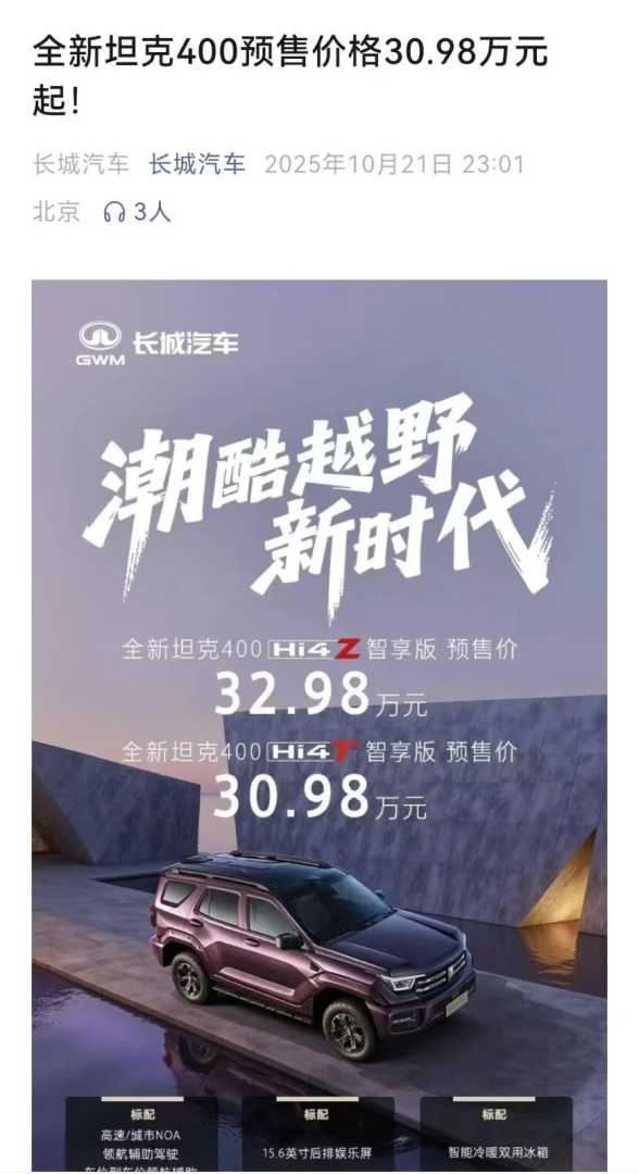 10月21日晚间,长城汽车官微宣布,新款坦克400正式开启预售,预售价格30.98万元起,这标志着长城汽车在SUV领域又一力作亮相。