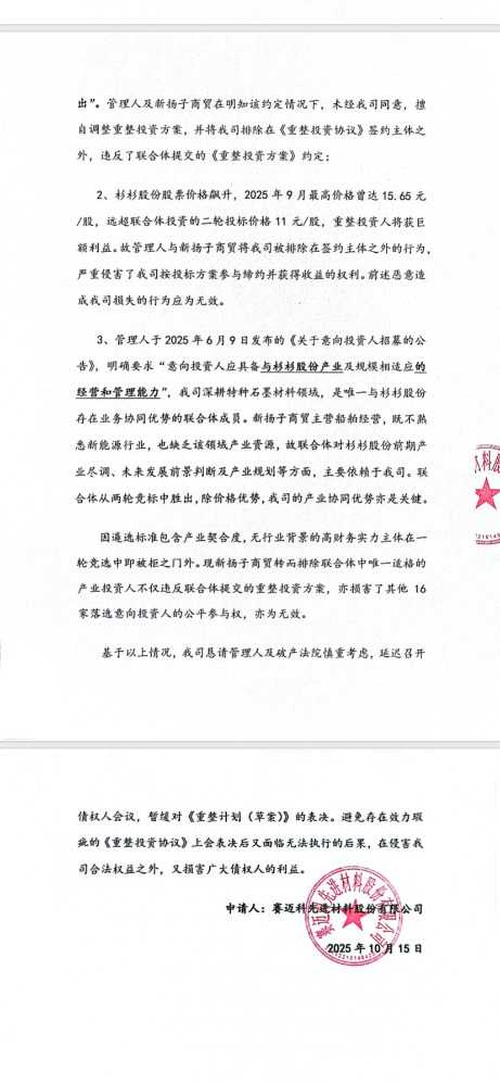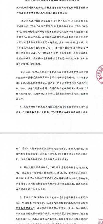 10月21日杉杉集团重整计划迎债权人会议,却聚焦“重整中标投资者离奇出局”事件。赛迈科起诉新扬子商贸等,法院正立案审查,提示重整协议成立存不确定性。