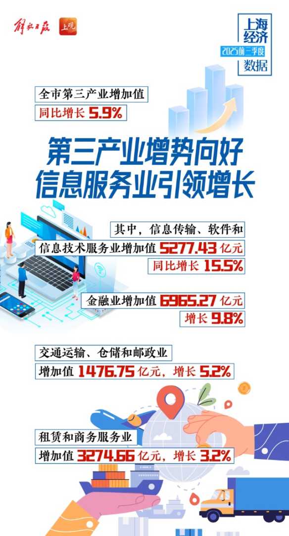 前三季度,上海市工业增加值同比增长5.2%,规模以上工业总产值同比增长5.7%,增速比上半年提高0.1个百分点。三大先导产业制造业产值同比增长8.5%,增速快于上海市规模以上工业总产值2.8个百分点,成为经济增长新引擎。同时,第三产业增加值同比增长5.9%,其中信息传输、软件和信息技术服务业增加值5277.43亿元,同比增长15.5%,金融业增加值6965.27亿元,增长9.8%,展现出服务业的蓬勃发展。
