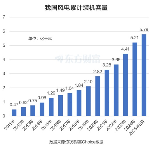 国家能源局数据显示,截至2025年8月,全国风电装机容量为5.79亿千瓦,同比增长22.1%,今年1~8月新增装机容量为5784万千瓦。此前2023年、2024年新增装机容量分别为7566万千瓦、7982万千瓦。