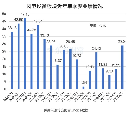 从业绩来看,在海内外市场双轮驱动下,尤其海外需求高景气下,风电设备企业的业绩整体向好。新强联10月21日晚披露的三季报显示,公司前三季度营业收入为36.18亿元,同比增长84.1%;归母净利润为6.64亿元,上年同期公司亏损0.36亿元。其中风电行业需求回暖,风电装机需求持续释放,是新强联认为的业绩增长的原因之一。而10月20日晚披露三季报的双一科技显示,公司前三季度营业收入为7.3亿元,同比增长15.41%;归母净利润为1.45亿元,同比增长125.25%。而该公司主要产品为新能源风电复合材料部件。还有广大特材披露的三季报业绩预告显示,2025年前三季度实现归属于母公司所有者的净利润为2.48亿元左右,与上年同期相比,预计增加1.69亿元左右,同比增加213.92%左右。该公司表示,风电齿轮箱零部件项目产能逐步释放,并因产能释放而有效降低单位固定成本,实现盈利。整体而言,东方财富Choice数据显示,2025年第二季度风电设备板块实现归母净利润29.04亿元,同比增长19.02%,环比第一季度增长119.5%。