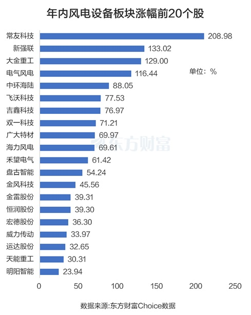今年以来,风电设备板块持续走强,截至10月21日的累计涨幅为48.37%。板块中的常友科技(年内上市新股)、新强联、大金重工、电气风电强势翻倍,年内分别累涨208.98%、133.02%、129%、116.44%。中环海陆、飞沃科技、吉鑫科技、双一科技也涨幅靠前。风电设备(风电设备板块)板块的强势表现,反映了市场对行业未来发展的高度认可。