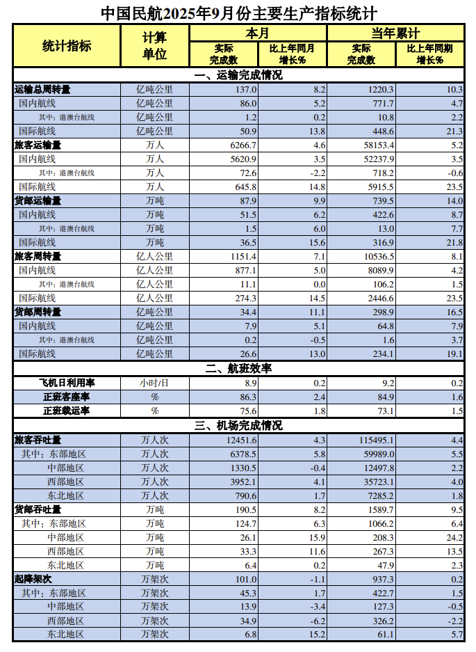 10月22日,中国民航局公布数据显示,2025年9月民航全行业运输总周转量、旅客运输量、货邮运输量同比分别增长8.2%、4.6%和9.9%,反映民航业强劲增长。