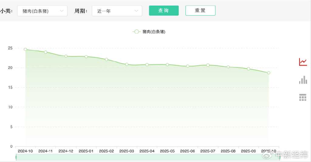 从养殖企业披露的数据来看,2025年8月、9月,牧原股份、温氏股份、新希望商品猪销售均价已连降两个月,其中2025年9月,牧原股份商品猪销售均价12.88元/公斤,环比下滑4.66%,同比下滑30.94%;温氏股份毛猪销售均价13.18元/公斤,环比下滑5.18%,同比下滑30.81%;新希望商品猪销售均价12.89元/公斤,环比下滑4.80%,同比下滑31.47%。