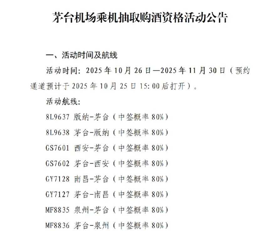 10月22日,茅台机场再次推出乘机抽取购酒资格活动,时间为2025年10月26日-11月30日。参与航线覆盖多地,中签率最高达90%,相比之前有所提升。