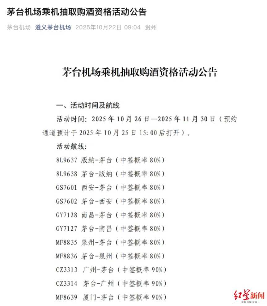 据“遵义茅台机场”微信号,今年10月26日至11月30日,在活动期间实际乘坐活动航线航班的旅客,可参与抽取购酒资格。抽中后,可按1499元/瓶的官方指导价购买飞天53%vol 500ml贵州茅台酒(带杯)2瓶,这样的优惠力度对于喜爱茅台的消费者来说颇具吸引力。