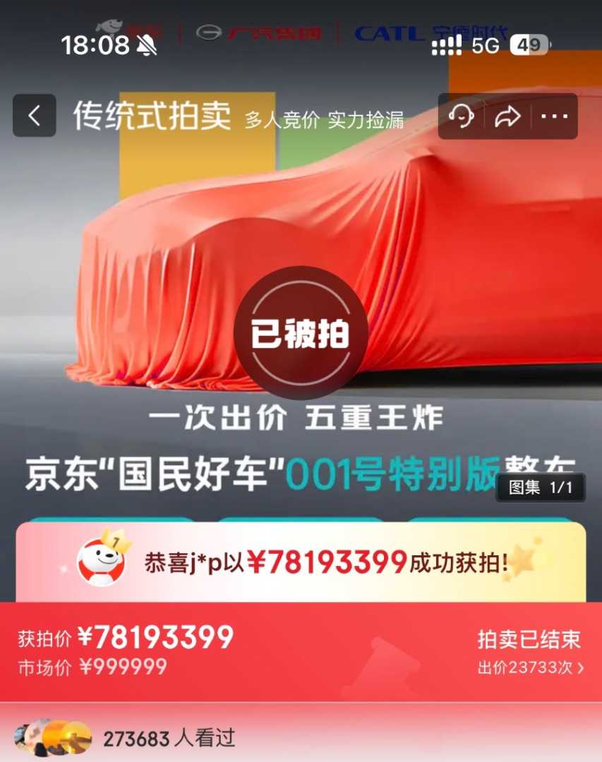 10月22日,京东001号“国民好车”拍卖引近30万人围观,4小时竞价超7800万元。该车由京东联合广汽集团、宁德时代推出,将于京东11.11期间正式发布并独家销售,性能卓越,引发市场热议。
