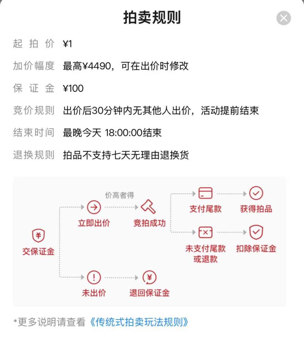 拍卖规则显示,此次竞拍起拍价仅1元,加价幅度最高4490元,保证金100元,如果放弃支付或支付后取消订单,将扣除保证金100元,这一规则确保了拍卖的公平公正。