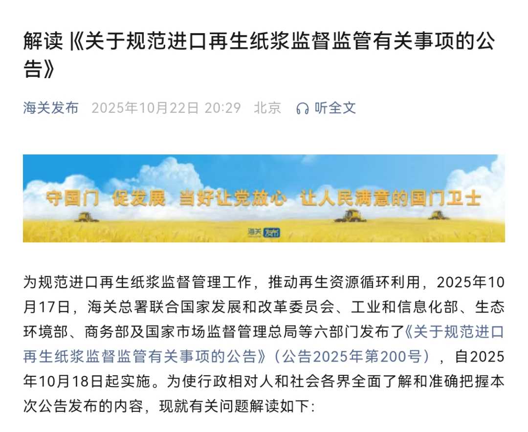 据微信公号“海关发布”消息,海关总署今(10月22日)晚就日前发布的《关于规范进口再生纸浆监督监管有关事项的公告》 进行解读,以使行政相对人和社会各界全面了解和准确把握本公告发布的内容。为规范进口再生纸浆监督管理工作,推动再生资源循环利用,2025年10月17日,海关总署联合国家发展和改革委员会、工业和信息化部、生态环境部、商务部及国家市场监督管理总局等六部门发布了《关于规范进口再生纸浆监督监管有关事项的公告》,自2025年10月18日起实施。该公告明确,进口再生纸浆的境外生产原料,须为分类回收的纸、纸板及纸制品,确保再生纸浆质量。