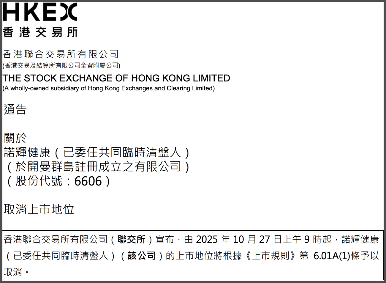 10月22日,香港联合交易所宣布,自10月27日起,正式取消诺辉健康(6606.HK)的上市地位,这一决定引发市场广泛关注。诺辉健康作为癌症早筛领域的先行者,自2021年2月在港股上市以来,一直备受投资者瞩目,被称为癌症早筛第一股。