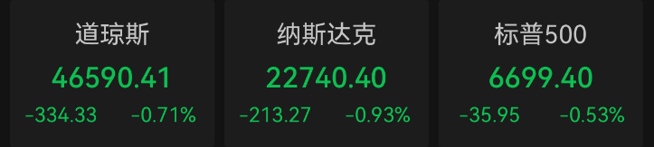 周三美股走弱,明星科技股奈飞和芯片制造商德州仪器业绩不佳,特朗普相关言论引发避险情绪。道指跌334.33点,跌幅0.71%,报46590.41点,纳指跌0.93%,标普500指数跌0.53%。