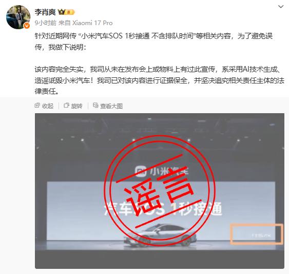 小米汽车副总裁李肖爽发文辟谣,称网传“小米汽车SOS 1秒接通,不含排队时间”内容完全失实,系AI技术生成造谣,公司已证据保全并追究法律责任。