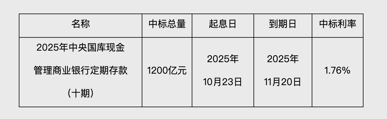 2025年10月23日,财政部与央行以利率招标开展中央国库现金管理商业银行定期存款(十期)招投标,中标总量1200亿,利率1.76%,影响金融市场资金流向。