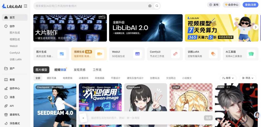 就在上个月,LiblibAI发布了2.0版本,将“聚合工具”升级为“AI专业创作工作室”,强化视频生成能力,支持多模型生成与专业级特效模板,进一步提升了用户体验。