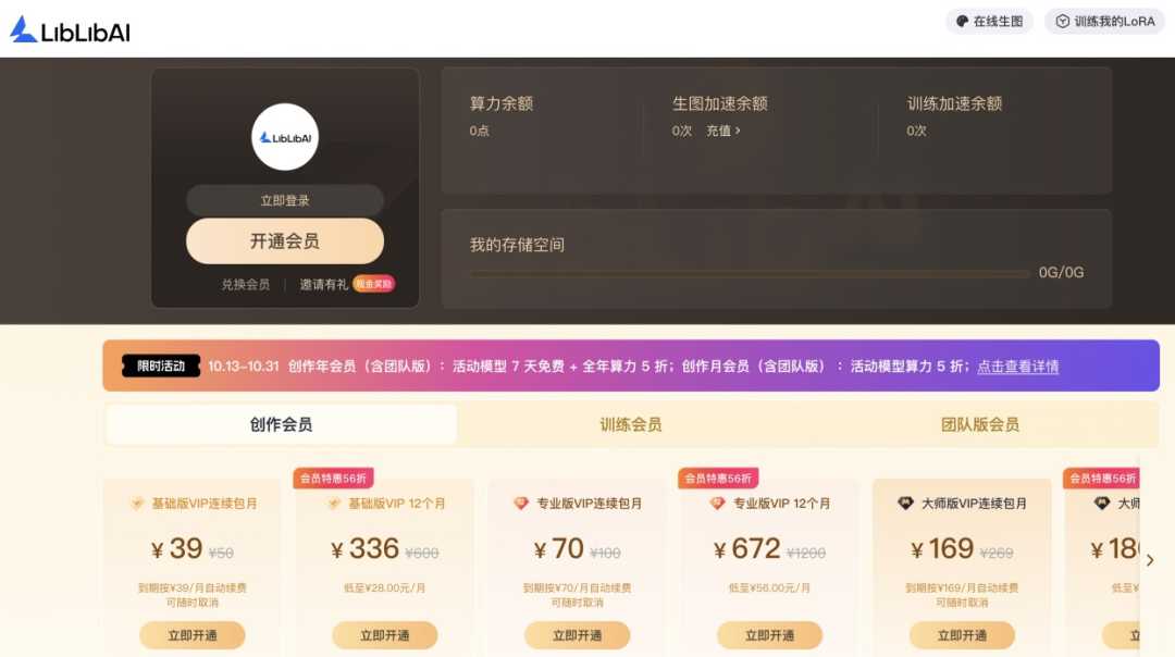 在商业化探索方面,界面新闻注意到,该公司目前针对不同用户推出了多个版本的收费模式,逐步搭建起从AI内容创作、分享、版权到售卖的生态链条。对于普通用户,LiblibAI提供有免费试用机制,所有注册用户每日可获得300点算力额度,在标准分辨率(512×768)下,大约能够生成300张基础图片。个人会员服务分为基础版VIP和专业版VIP两档。基础版VIP定价为35元/月,每月可获取15000点算力,大致能生成15000张图片。专业版VIP定价为70元/月,每月35000点算力可生成约35000张图片。对于企业级客户,LiblibAI则有相应的定制化服务。