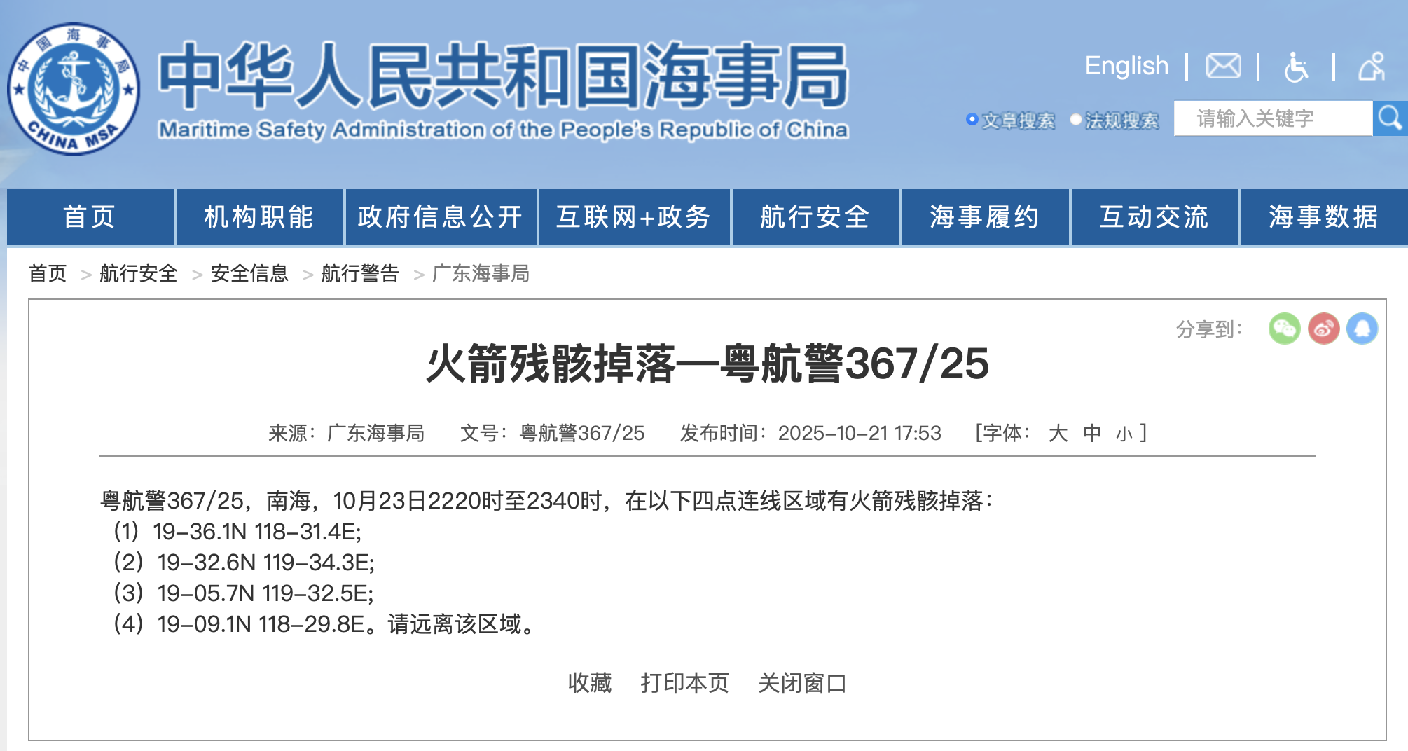 广东海事局发布航行警告:南海部分水域有火箭残骸掉落